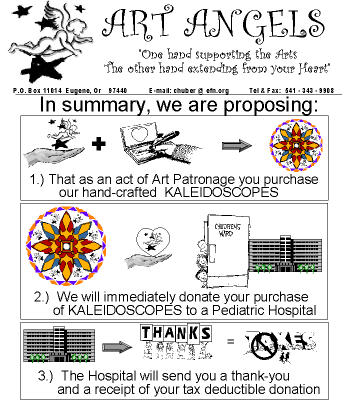 ART ANGELS is our unique concept of art patronage combined with charitable acts of loving-kindness. ART ANGELS unites a spirit of personal generosity with an understanding of the extraordinary and transcendental nature of art. We are proposing that you purchase Kaleidoscopes from us as an act of artistic patronage and that in turn you make a tax-deductible donation of these Kaleidoscopes to a non-profit Pediatric Hospital. |
