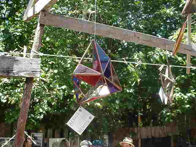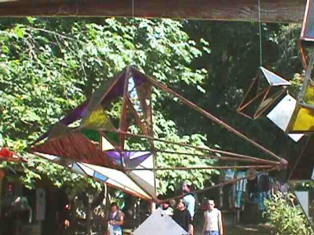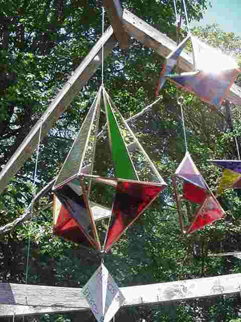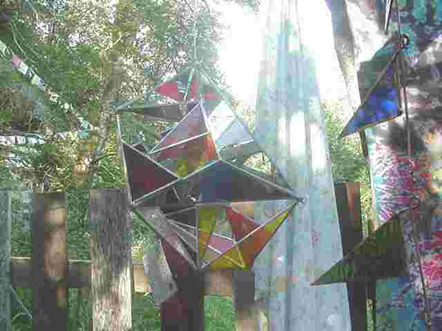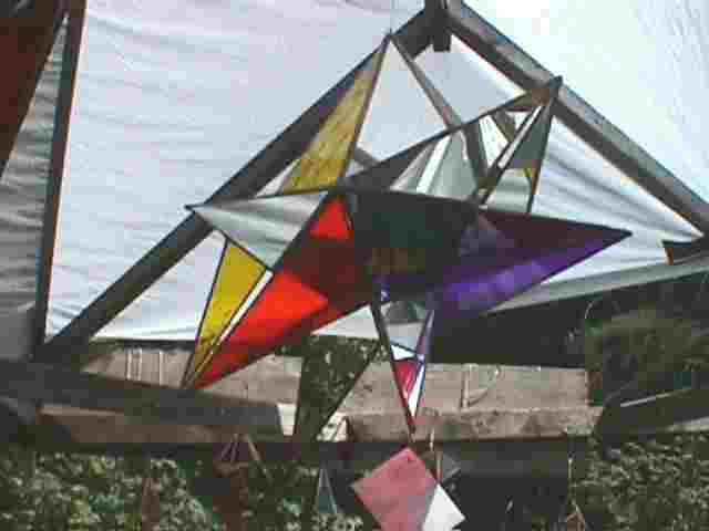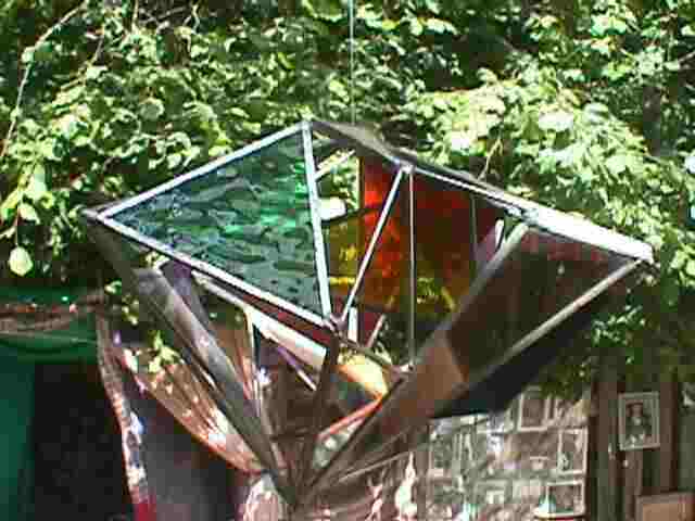 Welcome to my "Oregon Country Fair 2000" web page. I 've included pictures of my stained glass sculptures which I've named "BERGS" in honor of my wife Annie. There are also pictures of my Mobiles & Kaleidoscopes. I've also included pictures of 2 pieces that I designed for the OCF and participated in building. These are the Kaleidoscope titled "the BIG ONE" and the Labyrinth that I adapted from an ancient Cretan design. Kaleidoscopically yours, Craig Huber |