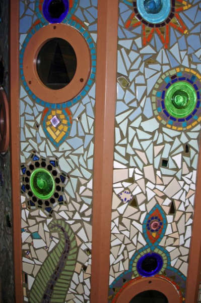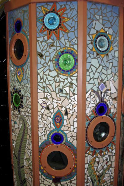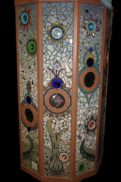 "THE BIG ONE" was designed by Craig Huber and built as a collaborative effort by Craig, Andy Strickland and numerous Oregon Country Fair volunteers. Pentagonal (10-sided) with 5 Teleidoscopes of varying angles & number of mirrors. Height: 2.2 meters / width 1.5 meters |