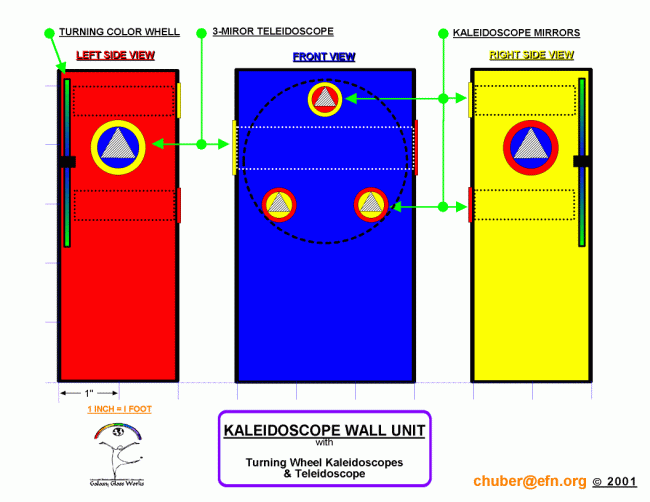 The "Kaleidoscopes with color turning wheel" is a classic Kaleidoscope interpretation. The 3 viewing portals allow the viewers to watch the turning color wheel create ever changing Kaleidoscopic images. A motor rotates the wheel. The Teleidoscope is a first surface mirror system with viewing portals on each end. This system allows viewers on each end to see the other viewer as a Kaleidoscope image. This design allows much surprise, as neither viewer is able to see the other viewer except as a Kaleidoscopic image through the viewing portals. Price: $6200.00 + Shipping PRICE INCLUDES: