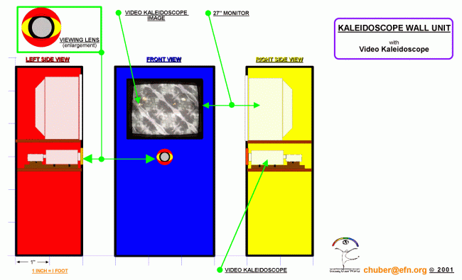 The Video Kaleidoscope has a commercial video camera (designed for 24/7 use) that records images in real time from the Kaleidoscope Unit that is placed in front of the camera. The Kaleidoscope Unit has a first surface mirror system with a focusing lens that captures whatever is placed in front of its aperture opening. The resulting Kaleidoscopic image is projected in real time onto the video monitor. The Teleidoscope is a first surface mirror system with viewing portals on each end. This system allows viewers on each end to see the other viewer as a Kaleidoscope image. This design allows much surprise, as neither viewer is able to see the other viewer except as a Kaleidoscopic image through the viewing portals. Price: $6000.00 + Shipping PRICE INCLUDES:
