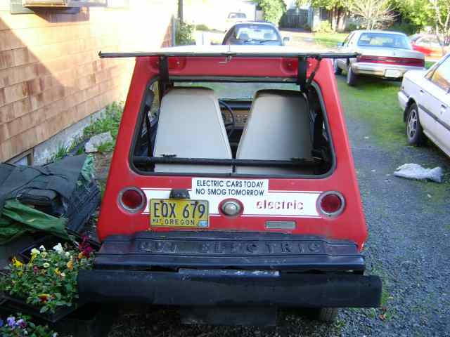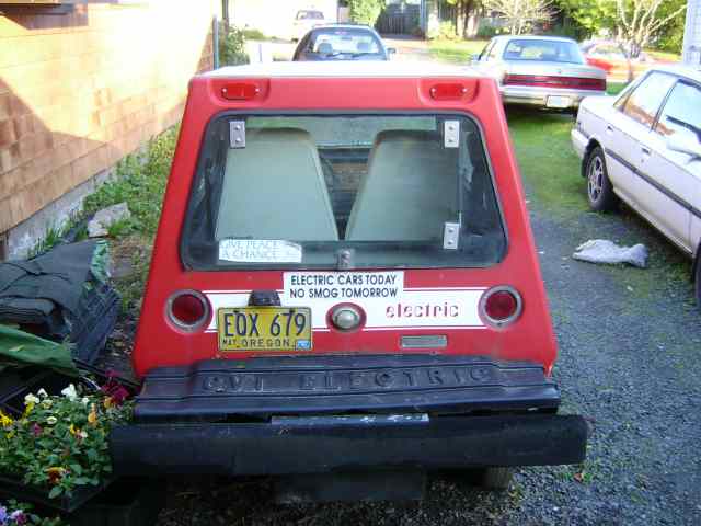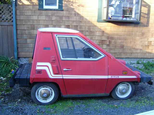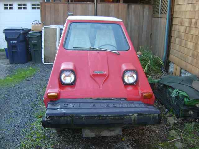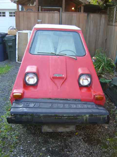 COMUTA CAR : This 1981 red mini trapezoid coupe was a part of the largest commercial production run of any single EV ( approx. 2000 production run ). Produced by Sebring - Vanguard, this 2-seater runabout is perfect for inner-urban commuting and dash-abouts. This 48 volt COMUTA- CAR has been updated with a state of the art "pulse modulated controller" ( PMC ), which allows for smooth acceleration.
