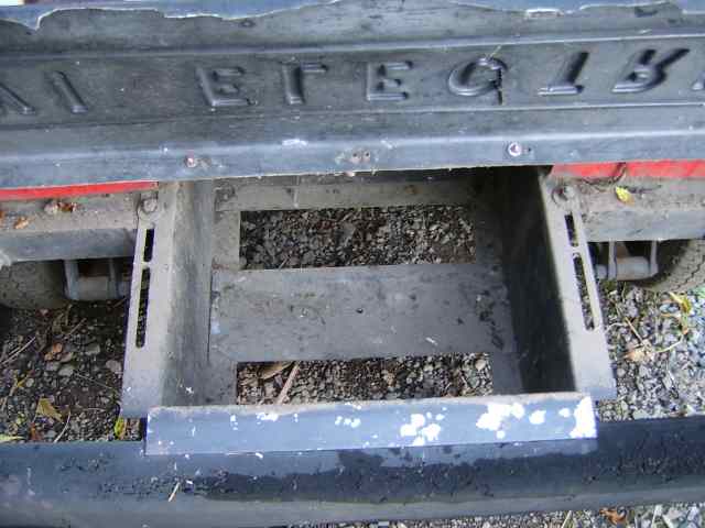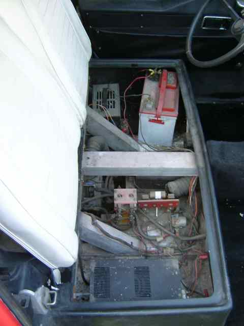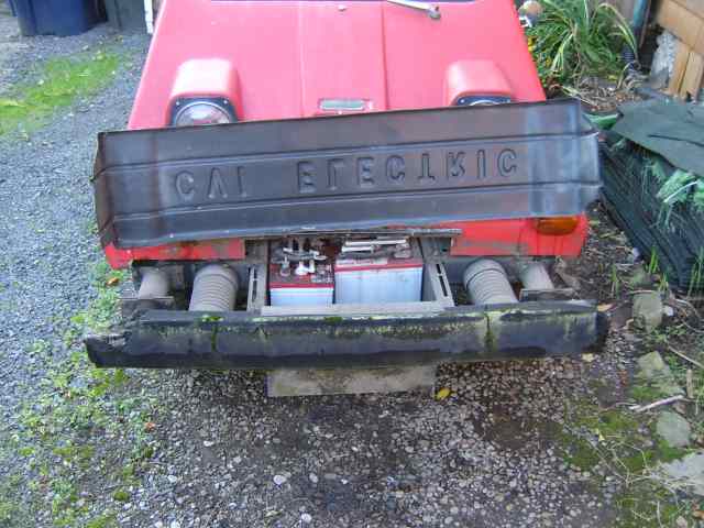 The Comuta-Car carries 4 of its 8 batteries in a box in the front of the vehicle and is a 48 volt system. In the photo at the left, the front battery cover is in the up position (thus explaining why the word are upside down).